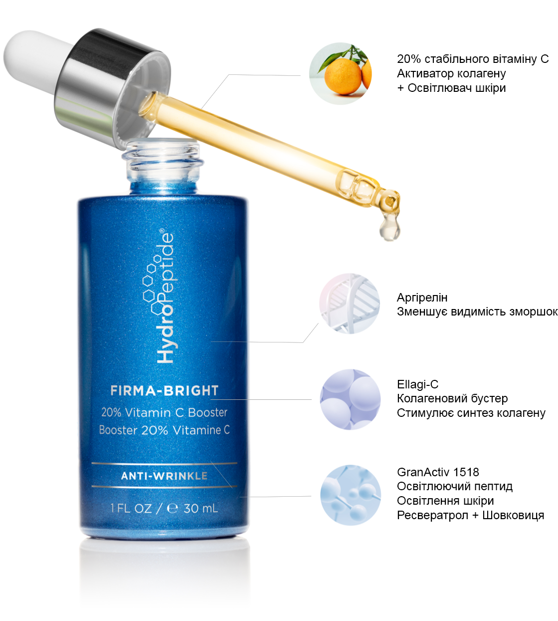 Нова сироватка-бустер Firma-Bright містить 20%-вий стабілізований вітамін С, що радикально змінює еластичність шкіри. Міксуйте Firma-Bright зі зволожуючим кремом або сироваткою. Засіб містить антиоксиданти, що борються з вільними радикалами та пептиди, що сприяють яскравому сяйву. Ці пептиди захищають шкіру та зменшують видимість тьмяності, мімічних та глибоких зморщок.